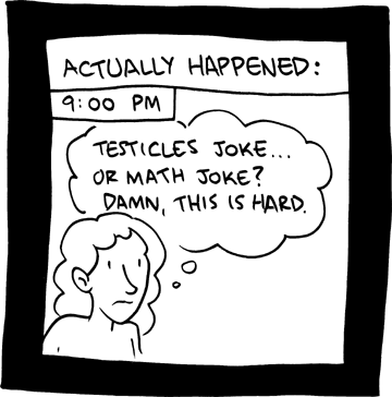 Whee! It's been a while since I did a comic this thinky. A few years ago I was discussing with Chason whether I should do this one comic idea I had about philosophy. His argument was basically this: Better to go smart in the hope that most of your audience will get it than to go dumb in the fear that most of your audience won't.